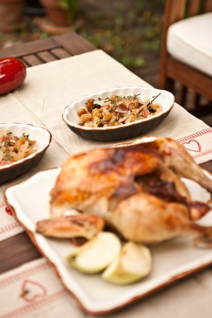- A csirkét egy tálra rakjuk. Az alatta sült almát az aszalványokkal együtt egy szedőlapáttal kiszedjük, hogy a zsír visszamaradjon, és külön tálaljuk a csirke mellé. Frissen fogyasztjuk.